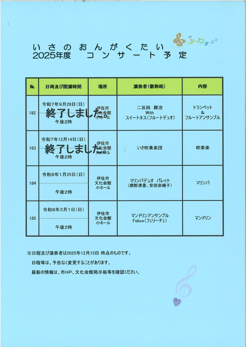 「いさのおんがくたいミニ・コンサート」を開催いたします。ぜひご来場ください。