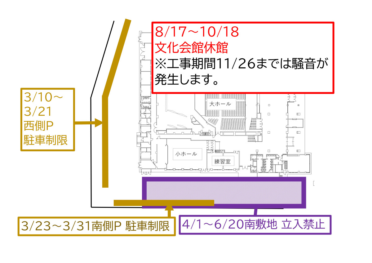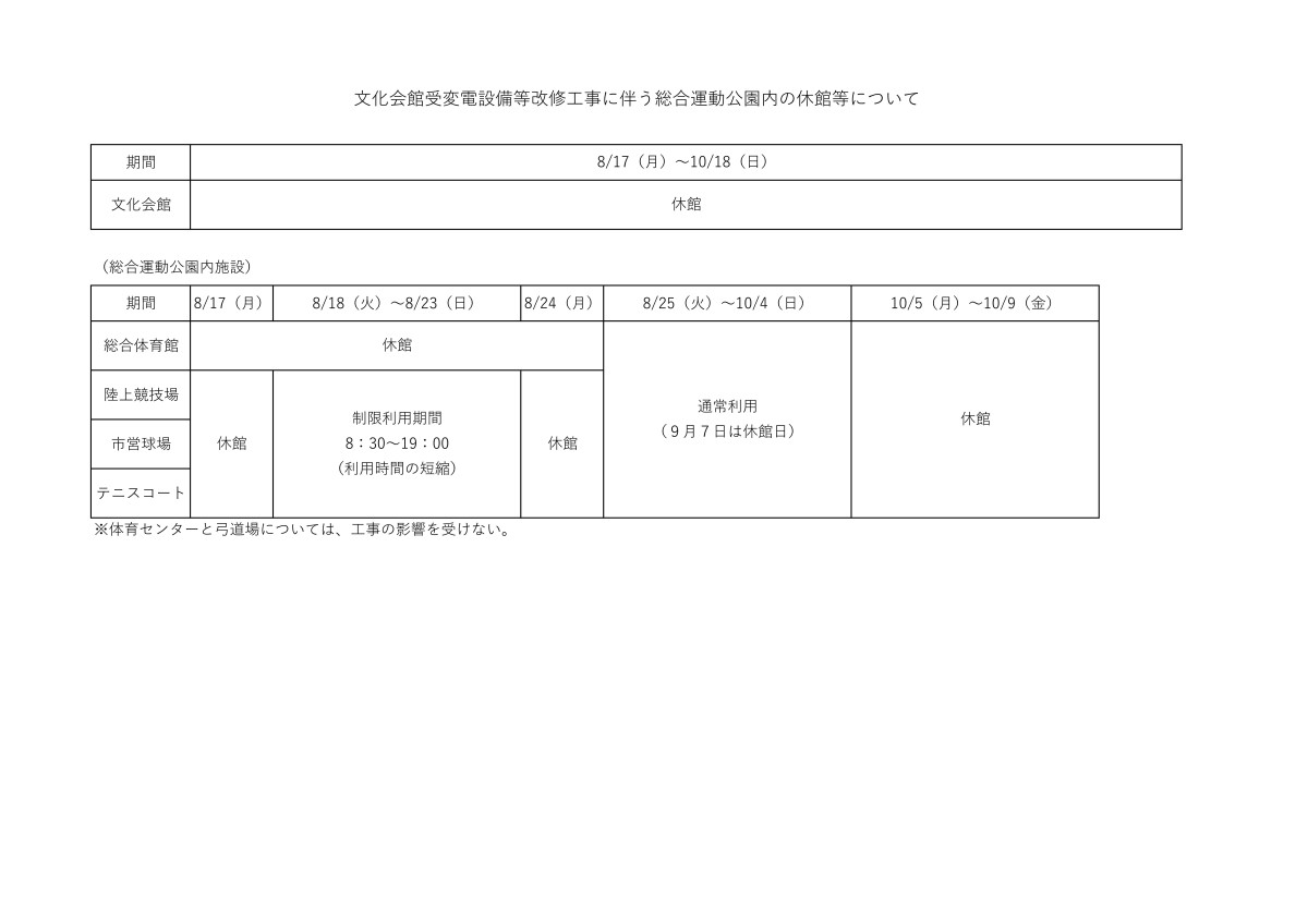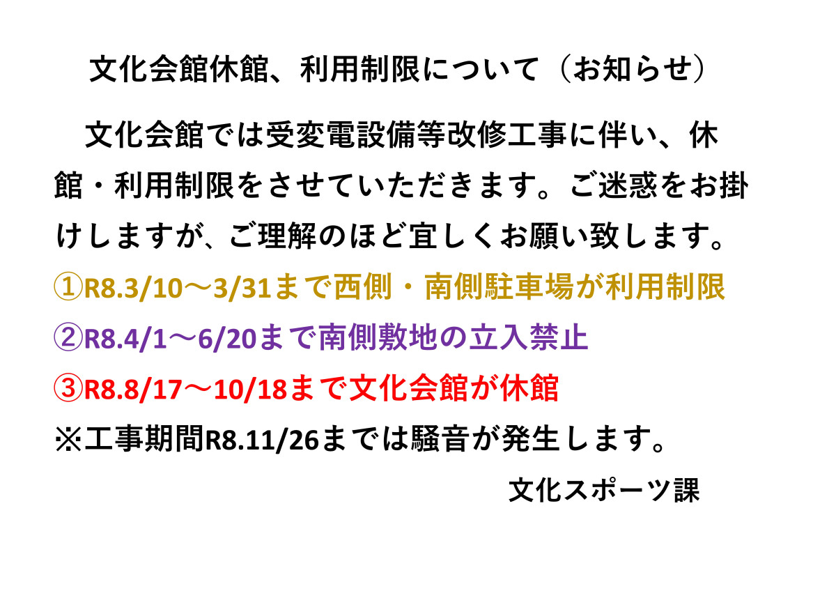 文化会館受変電設備等改修工事に伴う文化会館・総合運動公園内の休館・利用制限について