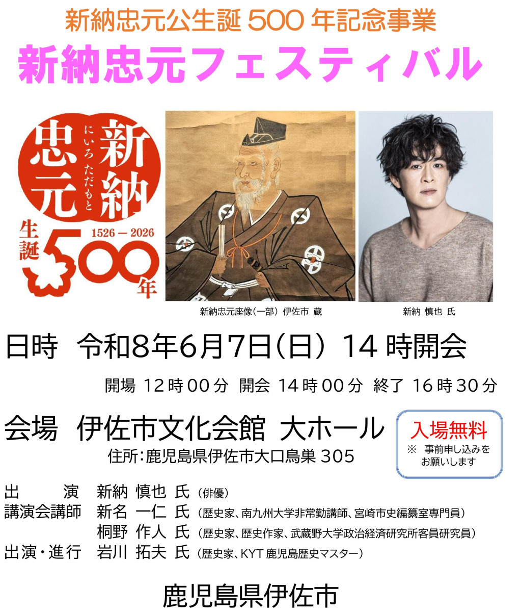伊佐市教育委員会では、新納忠元公生誕500年記念事業の一環として、俳優の新納慎也氏と歴史家の先生方をお招きして、次の日程で「新納忠元フェスティバル」を開催します。