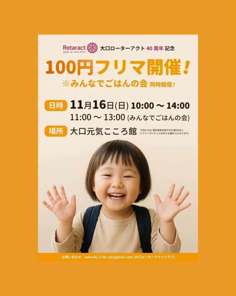 大口ローターアクトクラブさんの40周年を記念して子ども服中心の「100円フリマ」も開催されます!