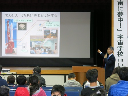 宇宙学校の校長を務める阪本成一教授の開校式に始まり、出水市出身の徳留真一郎准教授が「ロケット開発の最前線」、坂尾太郎准教授が「宇宙から見た私たちの太陽」というテーマで授業を行いました。
