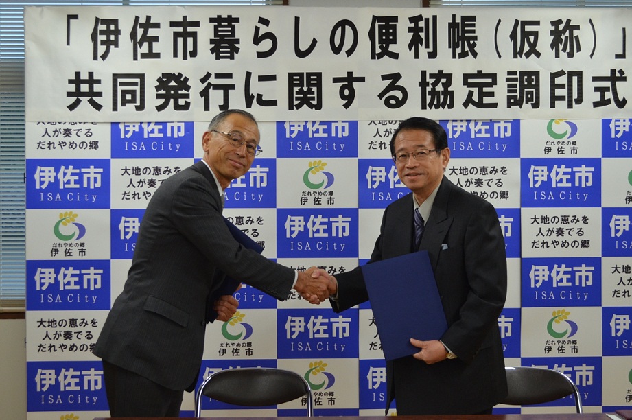 平成25年11月29日、伊佐市役所大口庁舎にて 「共同発行調印式」の様子