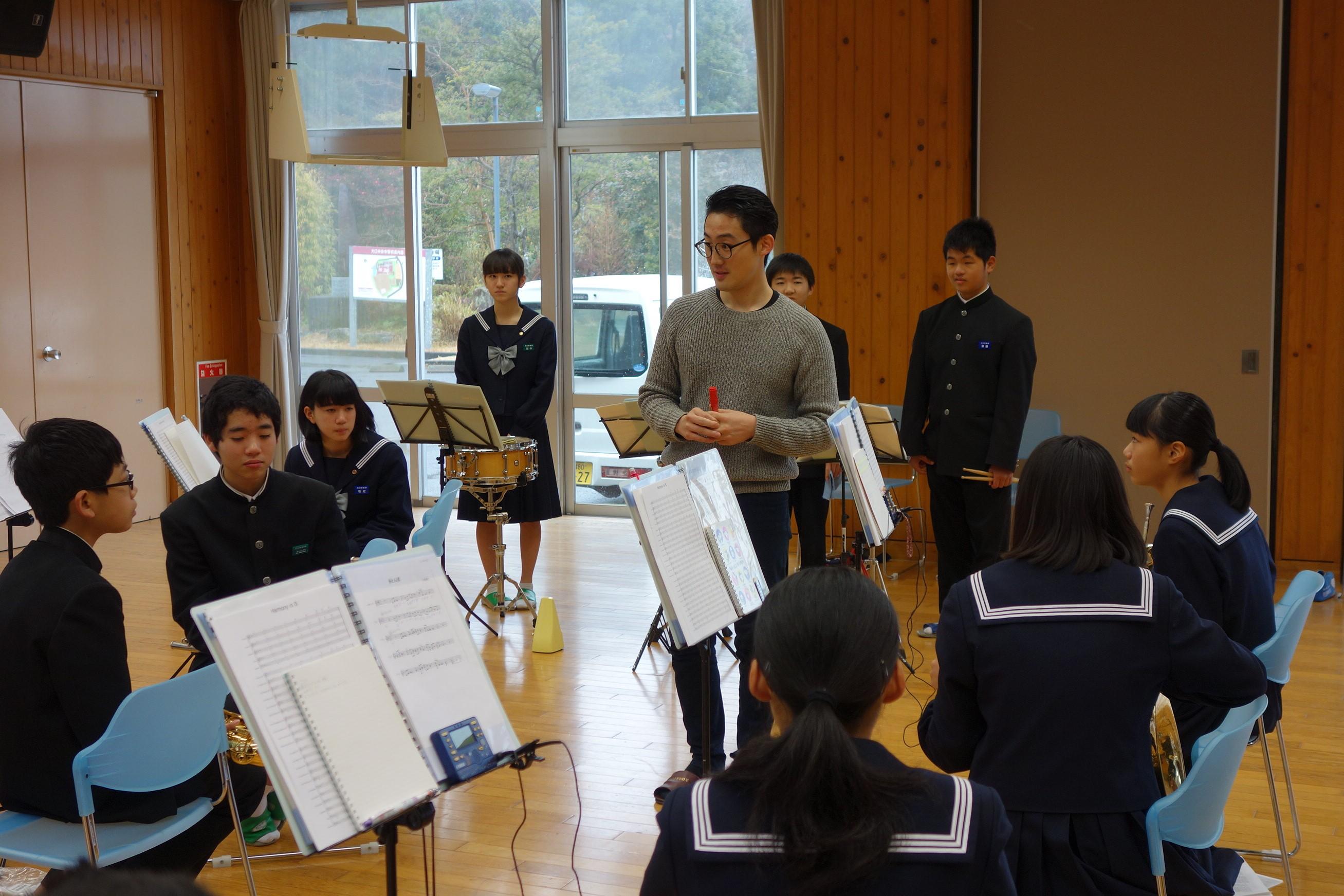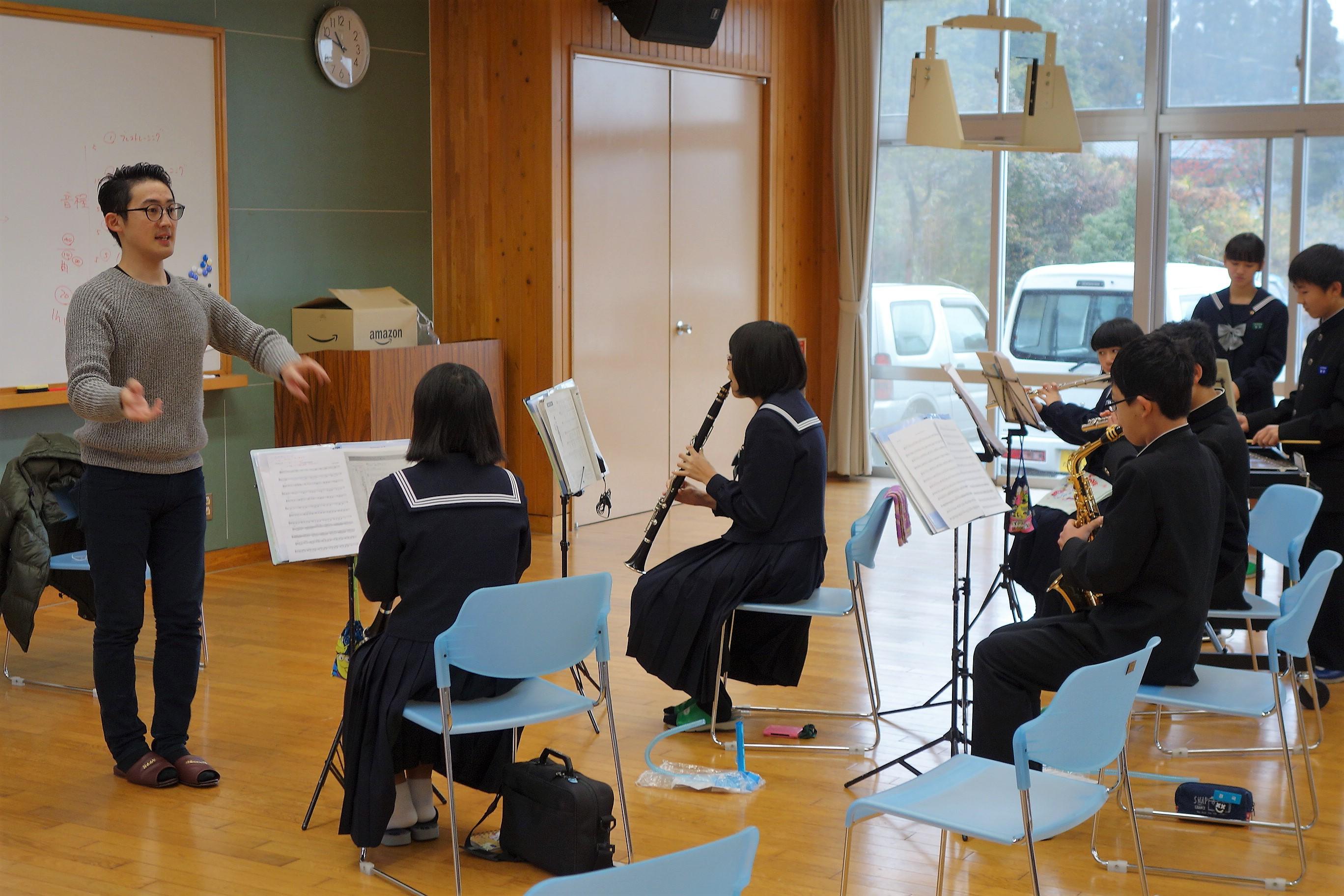 今回の講師は、伊佐市出身の音楽家・山﨑勇太氏で、大口中央中学校吹奏楽部を対象に、吹奏楽演奏の基礎を中心に指導をいただきました。(会場:大口中央中学校 多目的教室)