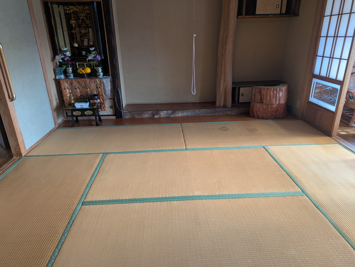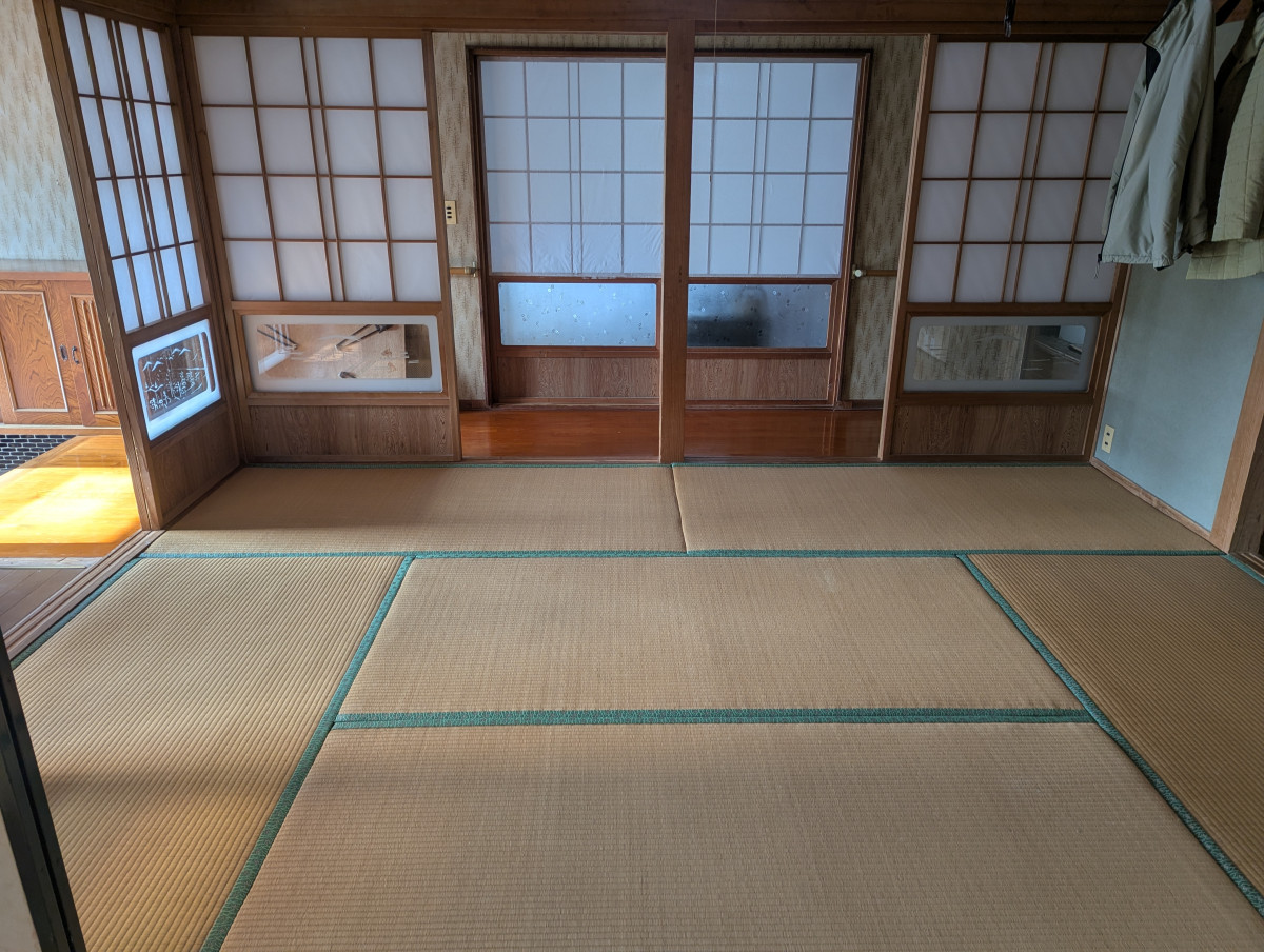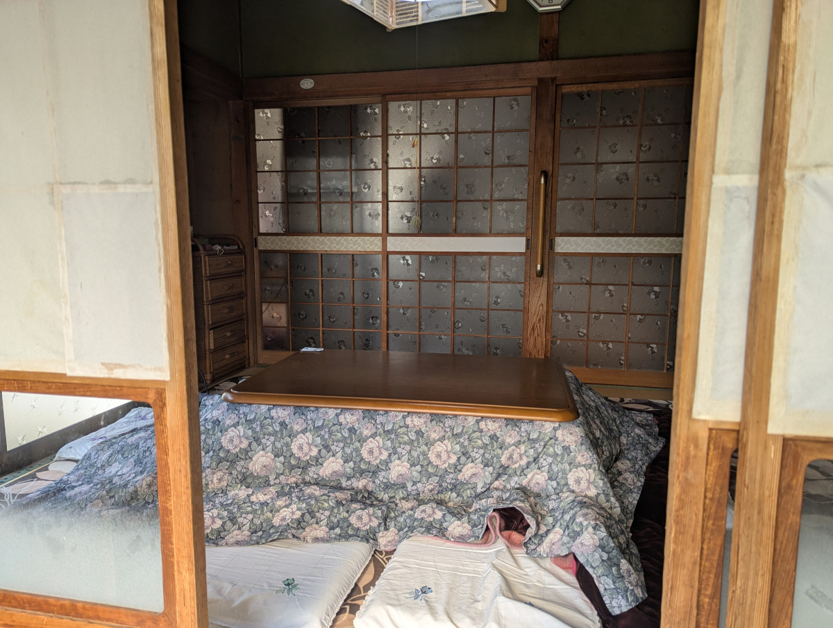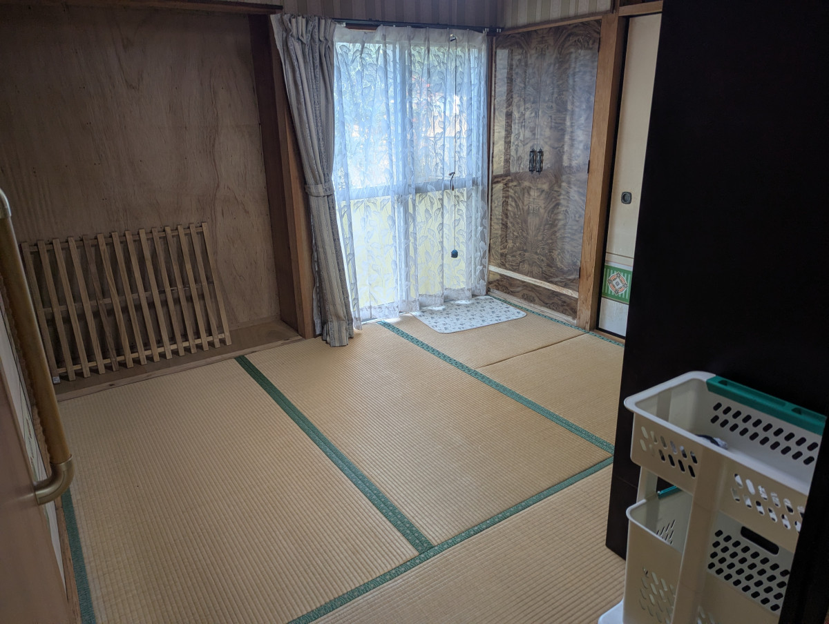 内覧させて頂いた当日は、6帖の和室にはこたつとカーペット、そして焚いている石油ストーブの上にはヤカンを置いて、暖を取られておりました。