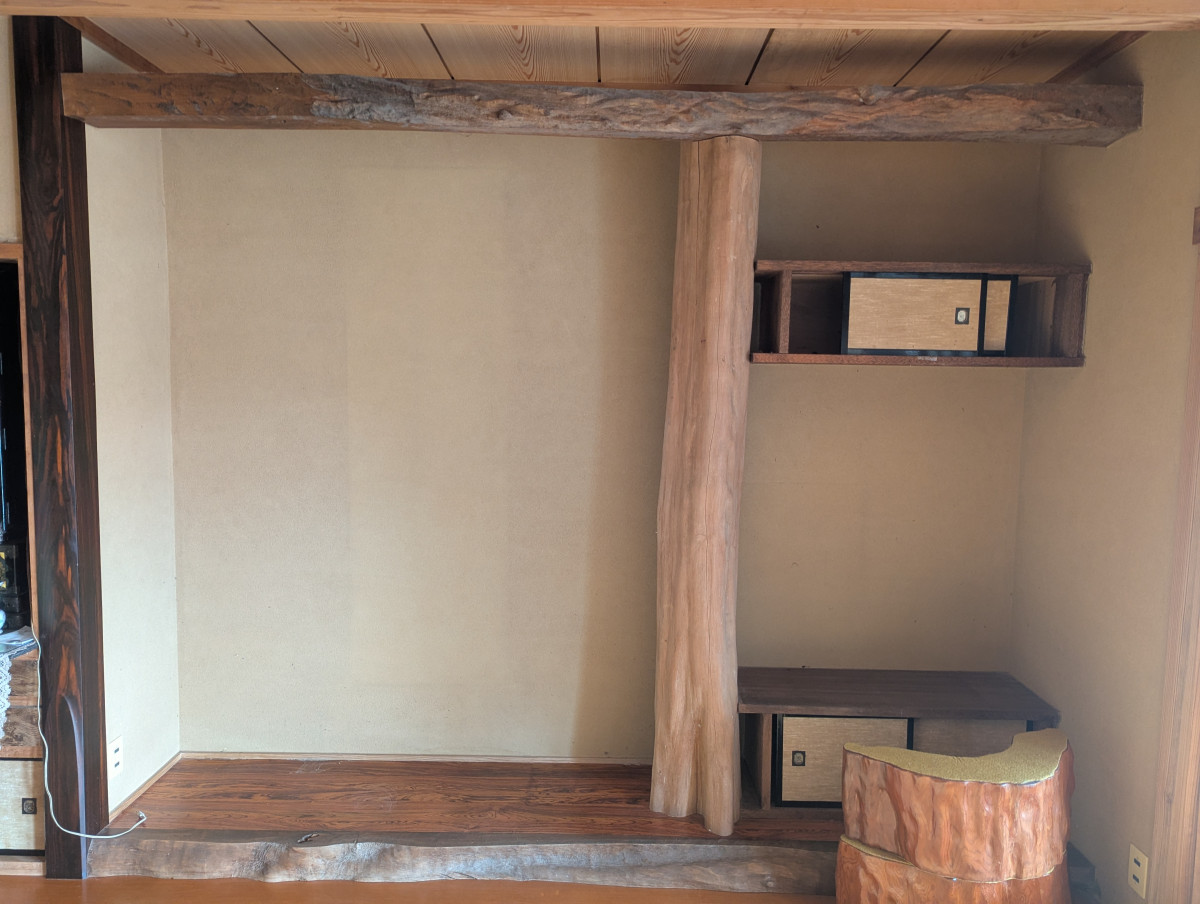 お部屋の床の間。落ち着いた色味ながらも存在感のある床柱と、その上の横に伸びている落とし掛けがなんとも無骨でカッコいいですなあ!
