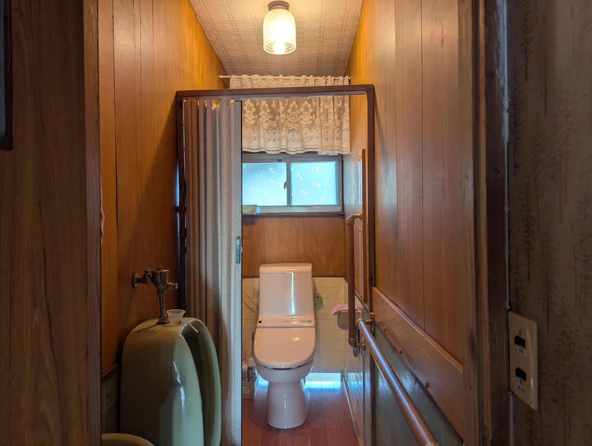 ウッディな室内をやんわりと灯す照明。淡い緑と白の便器が織りなすコントラスト。どこか北欧っぽく、落ち着いた雰囲気のお手洗いなのでした。