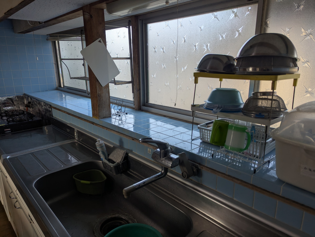 そしてバンク担当福田が心の底から「ええやん!」と思うこちらの出窓。写真のように洗い物置き場にもなりますし、フライパンやお鍋などの調理器具置き場としても活躍しそうです。コンロの前には、お料理でよく使う調味料も置けますね。水色の可愛らしいタイルはお掃除もお手軽な事でしょう!ええやん!